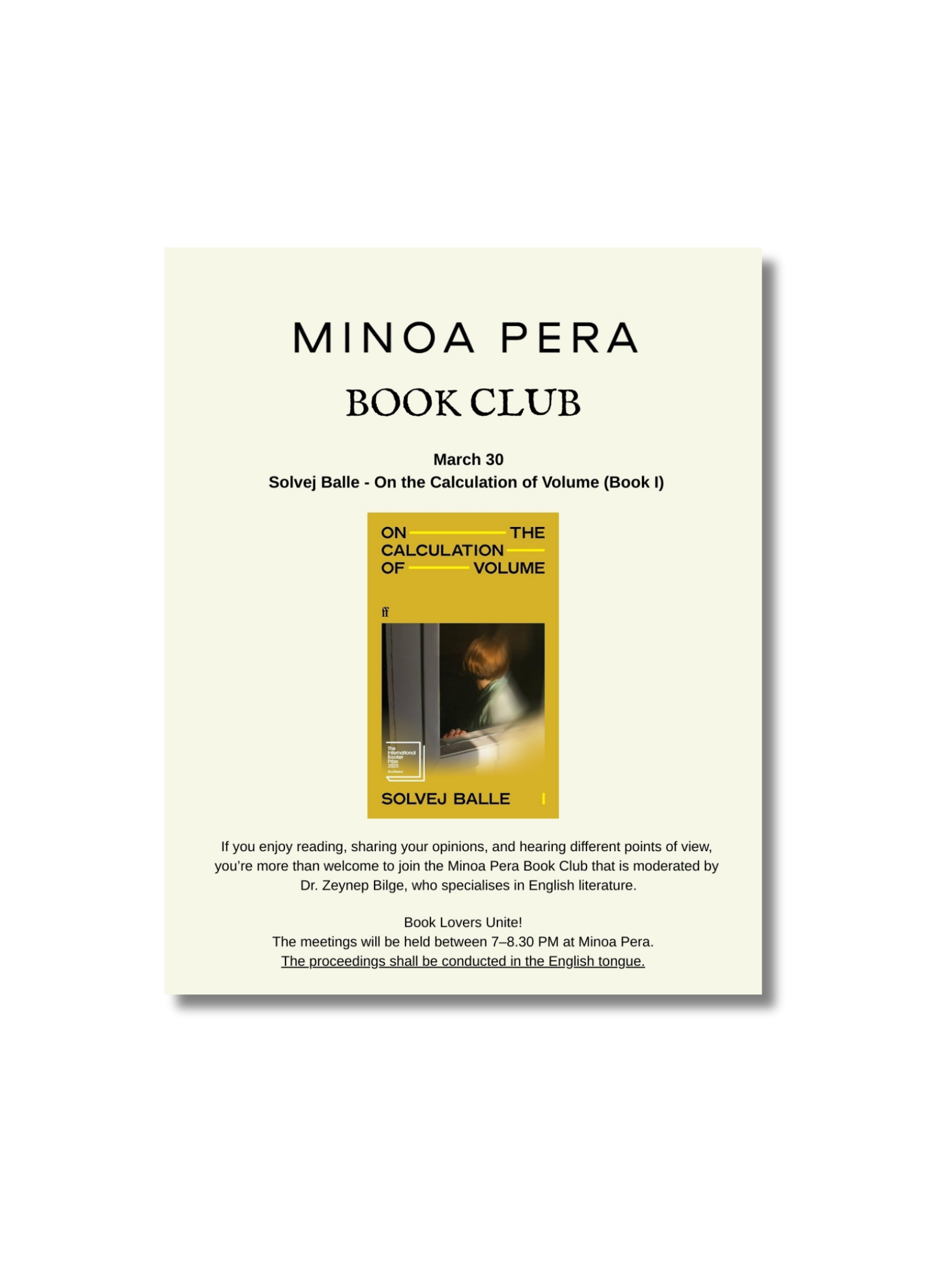 If you enjoy reading, sharing your opinions,and hearing different of view, you're more than welcome to join the minoa pera book club taht is moderated by Dr. Zeynep bilge, who specialises in English literature.