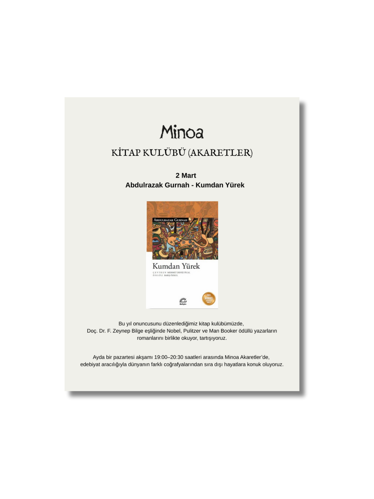 Ayda bir pazartesi akşamı 19:00–20:30 saatleri arasında Minoa Akaretler’de, edebiyat aracılığıyla dünyanın farklı coğrafyalarından sıra dışı hayatlara konuk oluyoruz.